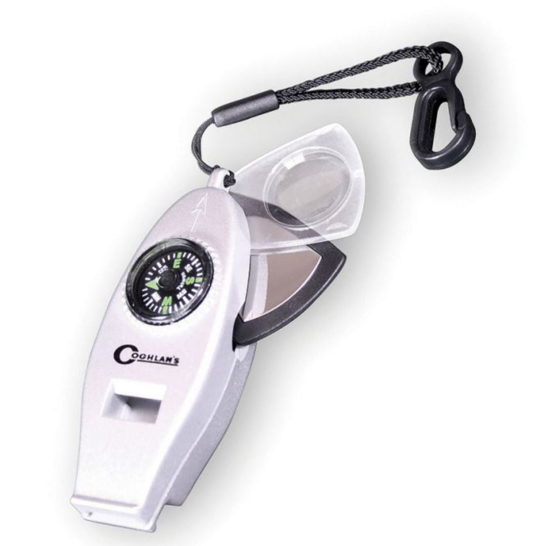 3.25" overall. Includes: LED light, compass, magnifier, thermometer, signal mirror, and whistle. Lanyard and attachment clip. Uses three SR1121 batteries (included).