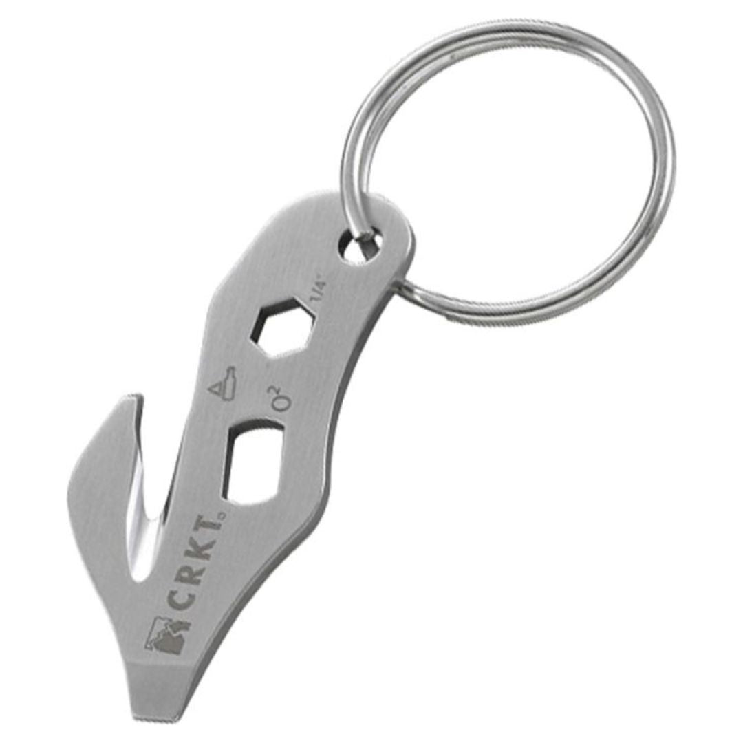 2.5" overall. 8Cr13MoV stainless construction. Tools include: Wrench l Bottle opener l Flat head screwdriver l Oxygen wrench l Belt/cord cutter l Lanyard loop l Keyring. Black vinyl pouch. Designed by Ray Kirk.