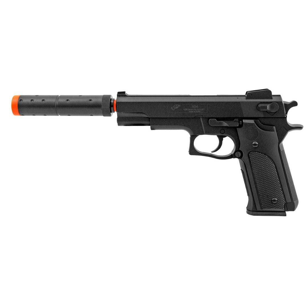 A 1:1 scale replica of a 1911 style pistol with a attachable suppressor style barrel extension. Produced by Double Eagle as a easy to use spring airsoft pistol, it requires no other power source to use. Simply pull the slide back before each shot and pull the trigger. Features a functional safety switch and detachable 15-round magazine. Made out of a tough and durable polymer, the airsoft gun fires shots at 300 FPS with 0.12g BB's. The mock suppressor can be attached and removed by screwing the suppressor from its threaded barrel tip. You may also be interested ammo for your new weapon, check out our Airsoft