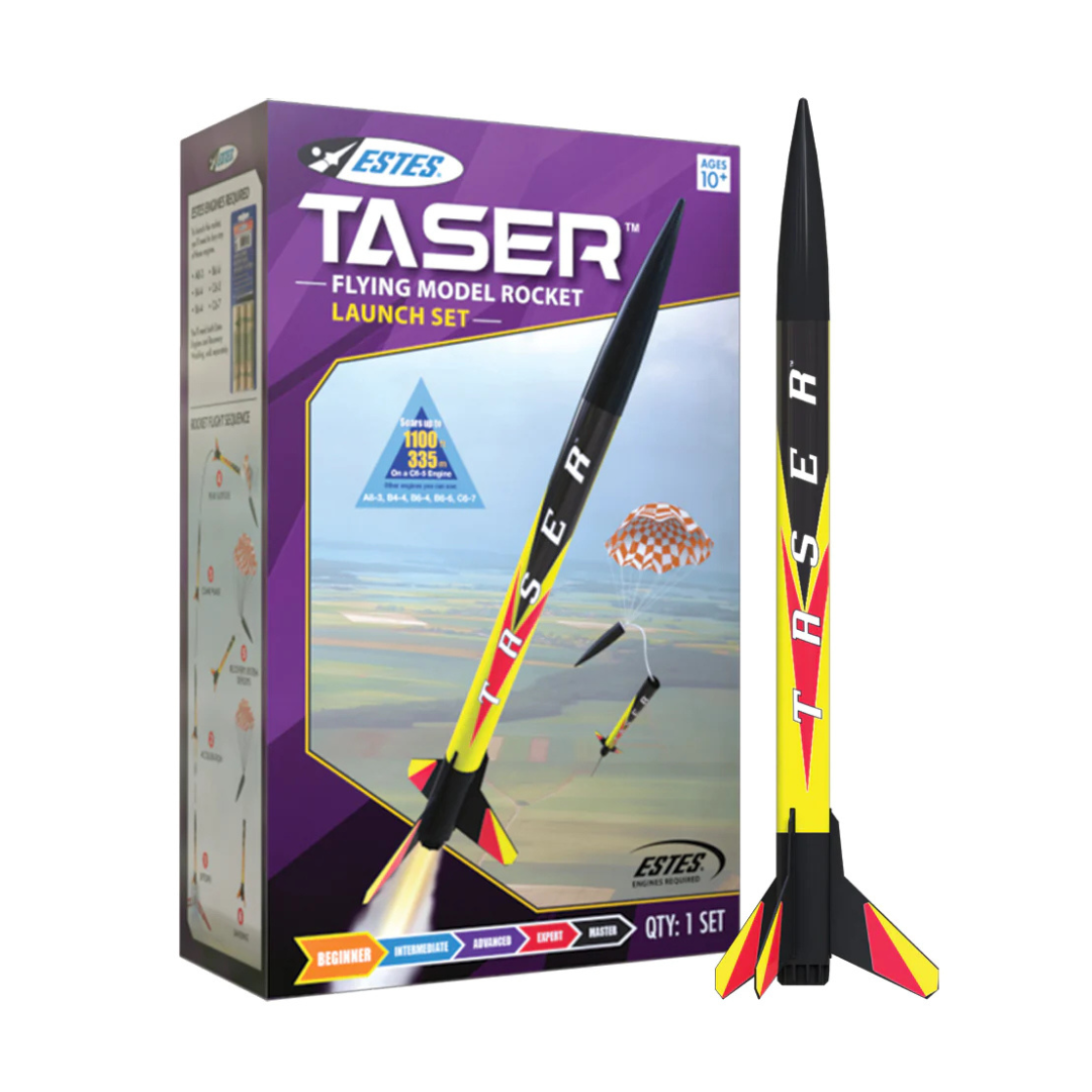 The Taser Launch Set from Estes is an exciting, radically designed high altitude rocket launch set that is easy to build. The rocket kit features a brightly colored one piece body tube, molded plastic fin set and bullet shaped nose cone. Simply glue a few rocket pieces together, apply the colorful self-stick decals and in less than an hour you'll be ready for the launch pad!