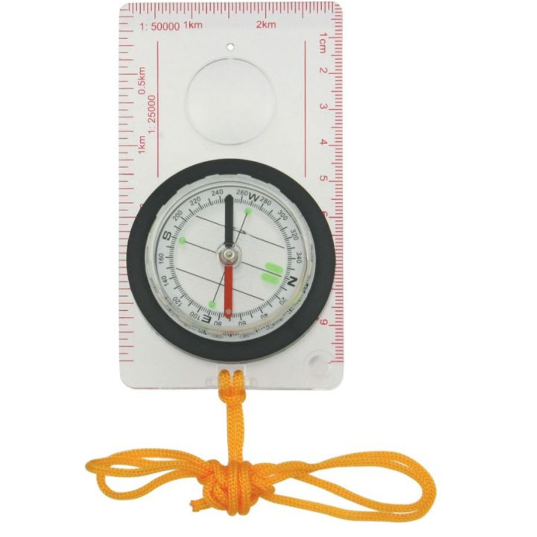 Dimensions: 4.25" x 2.38". Clear acrylic construction with black trim. Rotating bezel. Metric scale. Built-in magnifying glass. Gold cord lanyard.