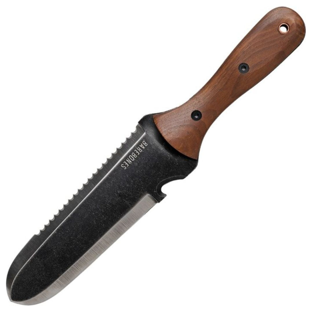 12.75" (32.39cm) overall. 6.75" (17.15cm) black stonewash finish stainless blade. Walnut handle. Full tang. Lanyard hole. Heat treated double edge (straight and serrated) blade. Integrated twine cutter and bottle opener. Sheath sold separately.