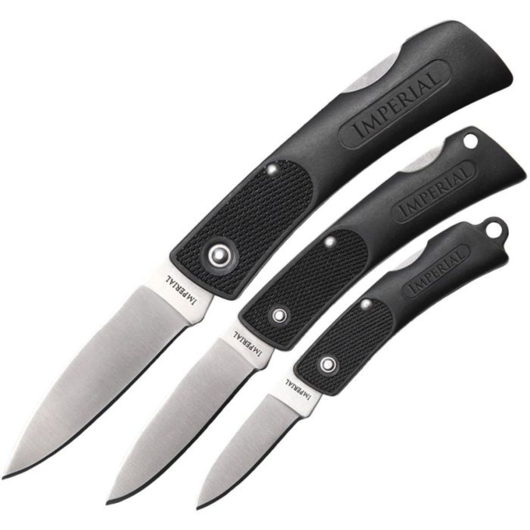 Satin finish stainless blade. Black textured plastic handle. Lanyard hole. 3.75" closed SP3 with 2.75" blade. 3" closed SP2 with 2.25" blade. 2.5" closed SP1 with 1.63" blade.