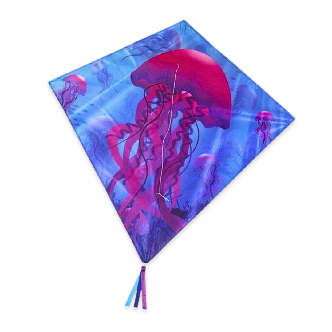 The Jellyfish 30" Diamond Kite features fully printed details that look great flying high in the sky. Diamond Kites are easy to fly and make great indoor decor. The (3) 12' color coordinated tails complement the kite and lend stability.