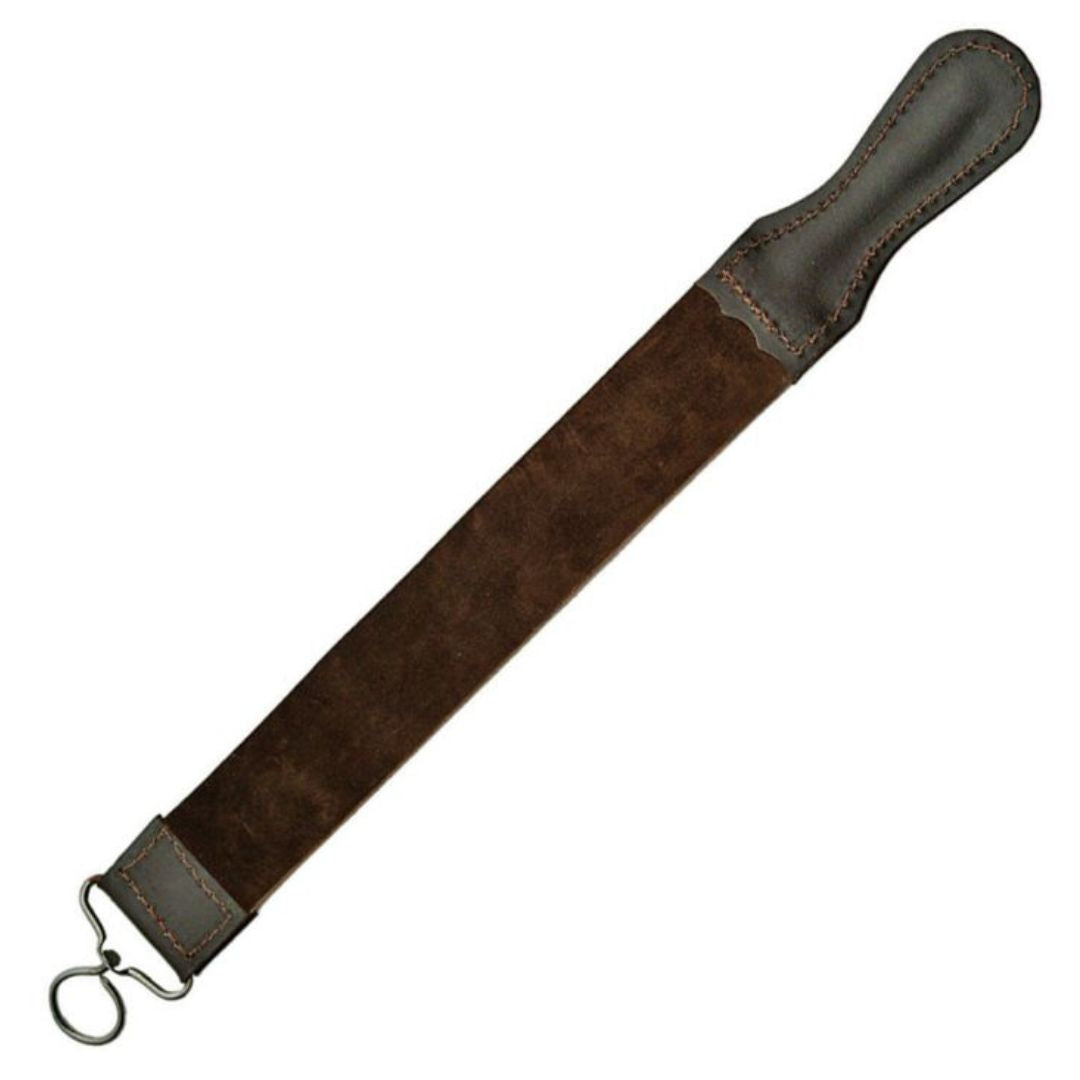 20" overall. Natural leather and dark leather sides. Steel ring on one end and handle on the other.