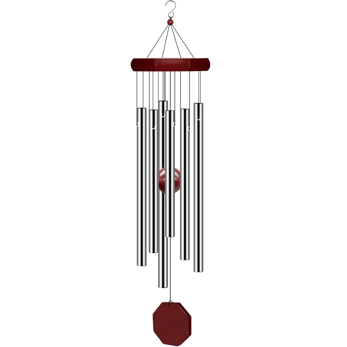 Size description: The total length of wind chime is 28 inches from the hook to bottom, the top diameter is 3.6 inches. There are six and beautiful aluminum tuned tubes that range in length from 6.8 inches to 10.9 inches.