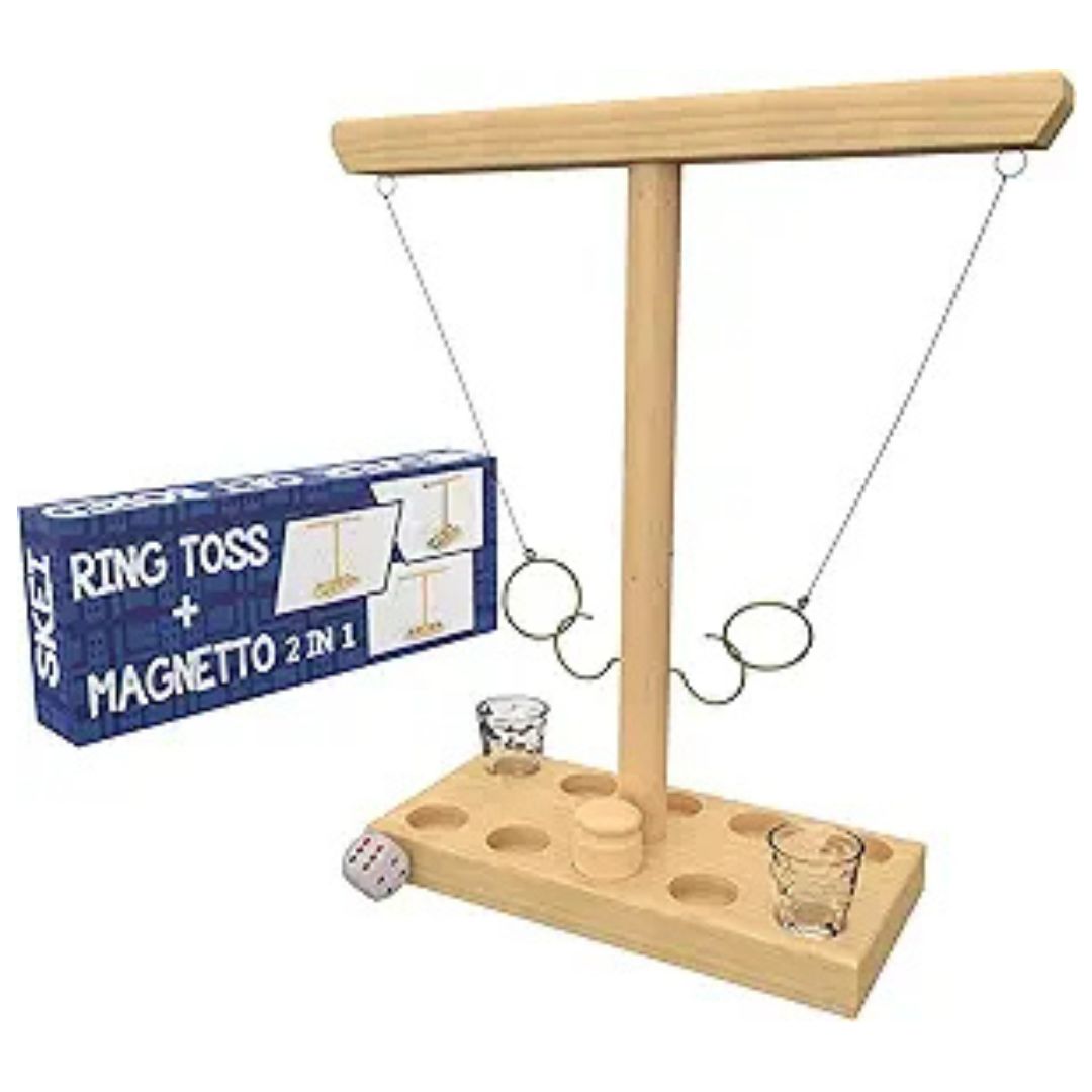 2 IN 1 GAME: Ring Toss with shot ladder is an exciting game for Adults. Main goal-throw a ring on the hook. Magnetto is a new game that has never been before. Players throw a small magnet and try to make it stick.