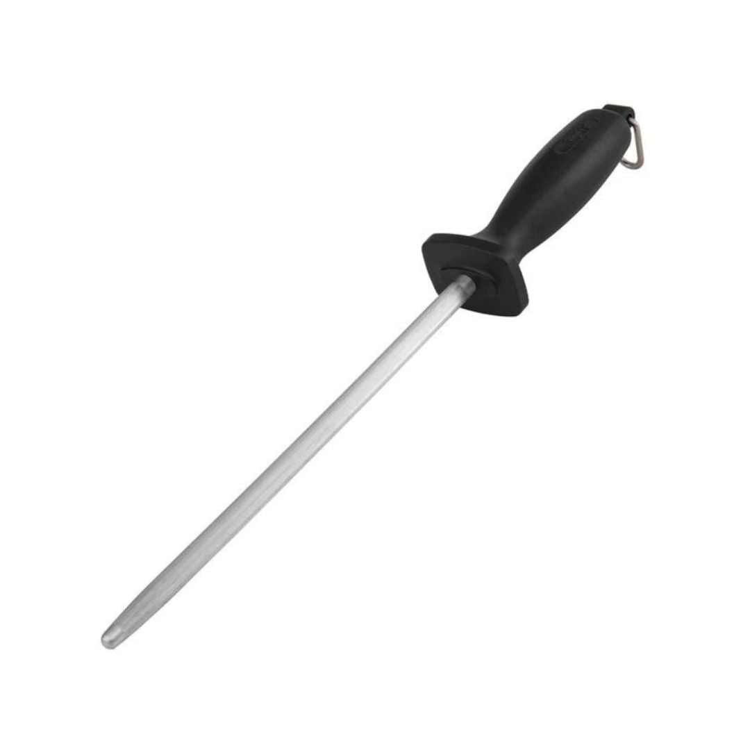 14" overall. Black synthetic handle. 9" steel rod. Realigns straight edge knives. Oversized hand guard.