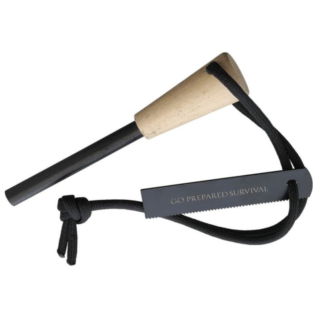 3-inch ferro rod. Comes with 5 inches of USGI Paracord, wooden handle and a logo striker. Peggable zip top bag.