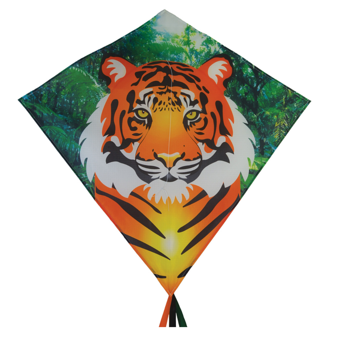 This easy to assemble and fly 30" Diamond Kite features a tiger and jungle design trailed by three 12' long color-coordinated streamers attached at the tail. Assembled from ripstop fabric with a fiberglass frame, this affordable kite is still a quality one. Recommended for wind speeds 6 - 20 mph and the kite line and storage bag are included.
